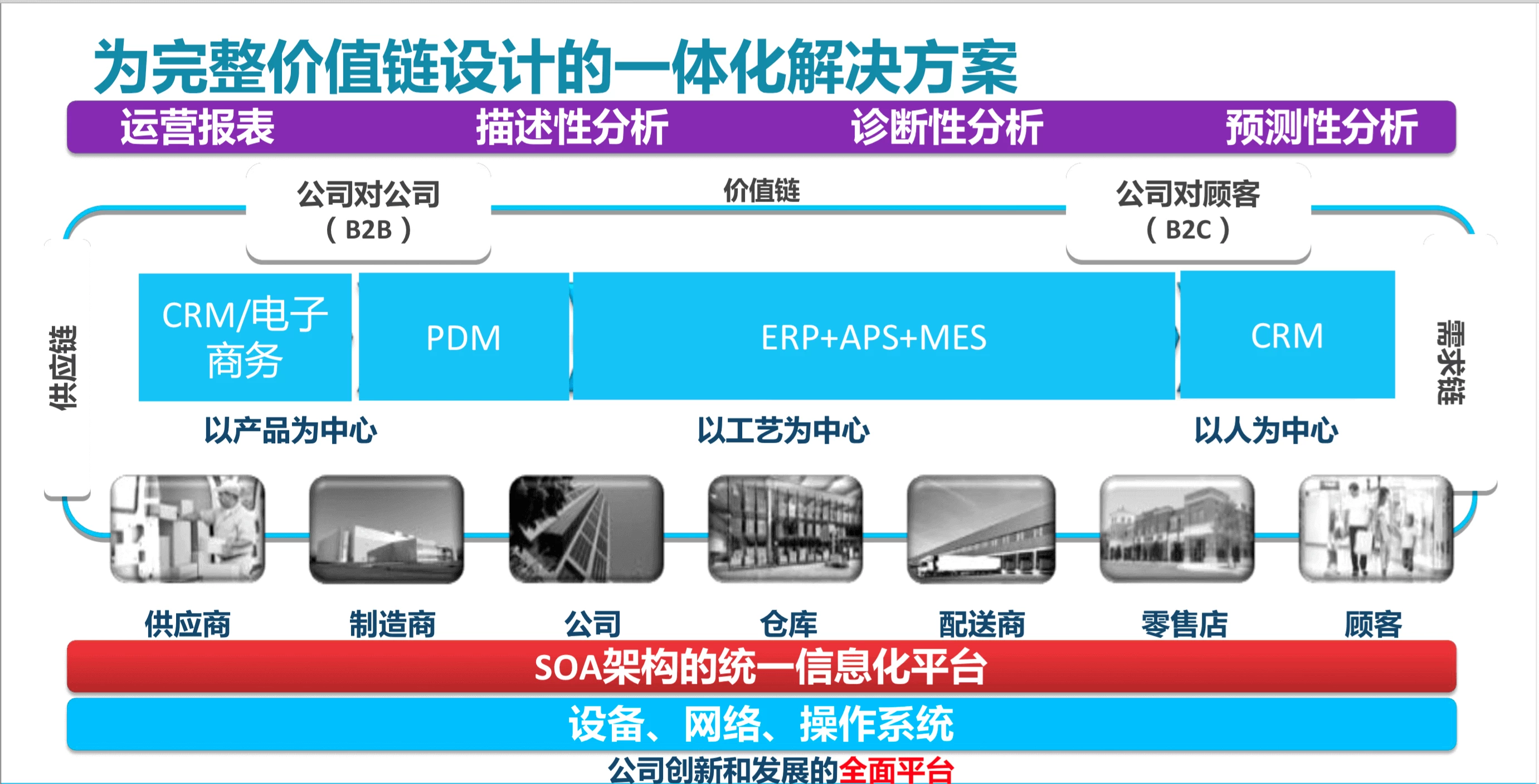 无论是工业4.0、数字化转型还是智能制造,核心的理念都离不开以“以客户为中心”。在这个理念引导下,对以往制造创新理念中提及的质量、交期、供应链等等都有了更高的要求。作为企业创新战略实现的管道。IT系统的建设也在支撑质量、效率、成本控制更高要求的同时,对内向生产、设备端延伸,对外在供应链建设上注重供应商及客户的关联。形成万物互联的IT应用趋势。